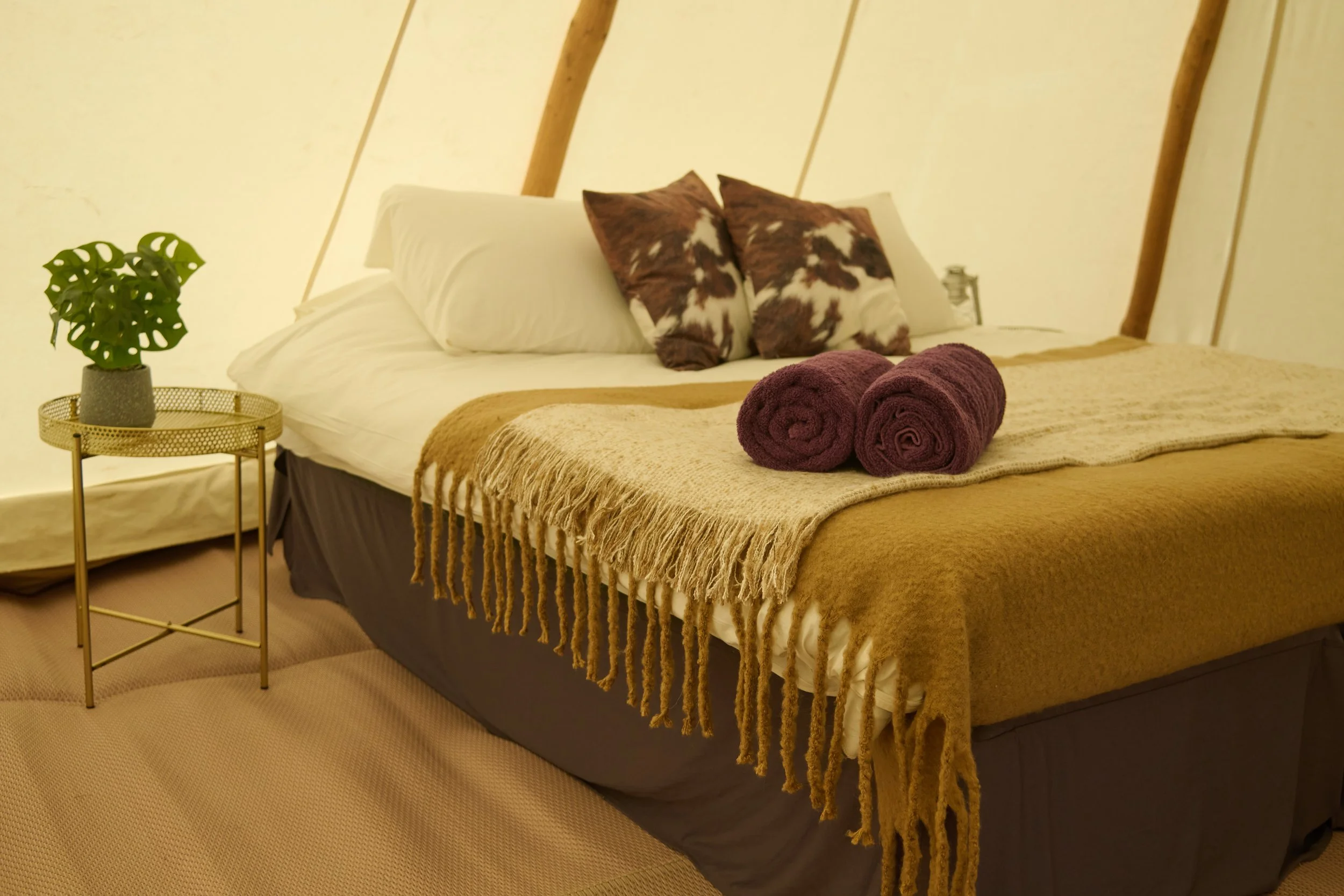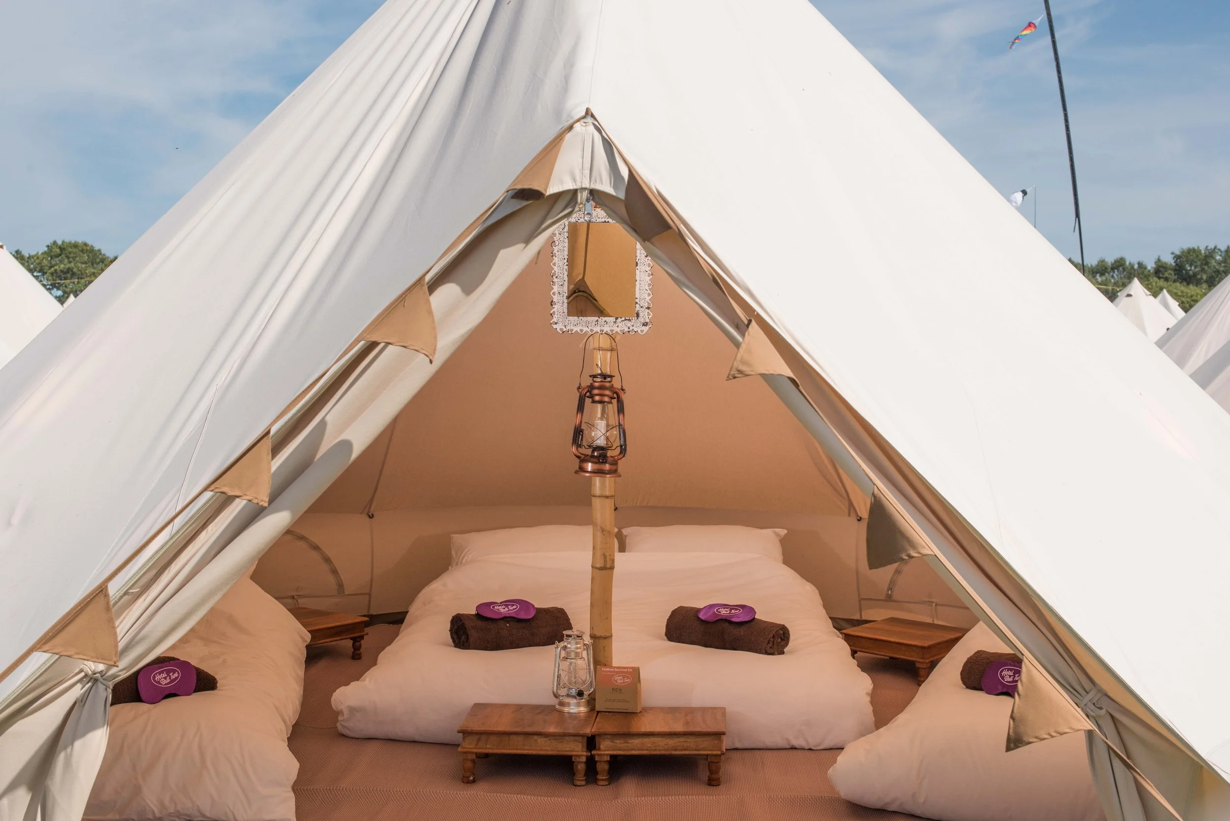 The Deluxe Bell provides next level luxury with real beds and bedding within a fully dressed tent for the most relaxed and super comfortable arrival at your event.
