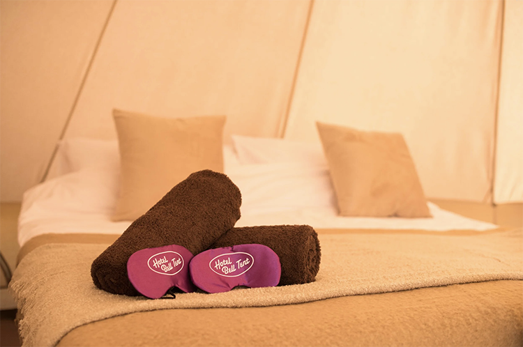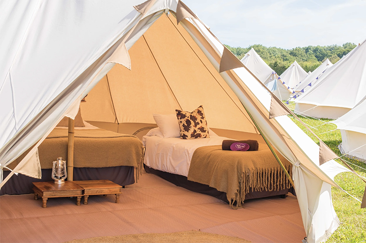 The Deluxe Bell provides next level luxury with real beds and bedding within a fully dressed tent for the most relaxed and super comfortable arrival at your event.