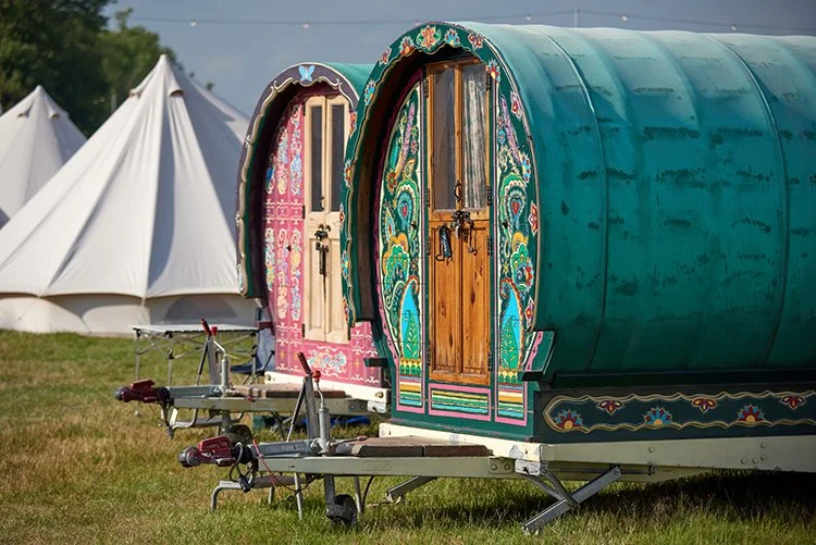 Perfect for couples, or families of 4 with small children, each unique Gypsy Bowtop Caravan is crafted from seasoned pine and organic Indian cotton and features a compact kitchen area, a lockable door and beautiful patchwork blankets giving you the optimum comfort and peace of mind throughout your stay.